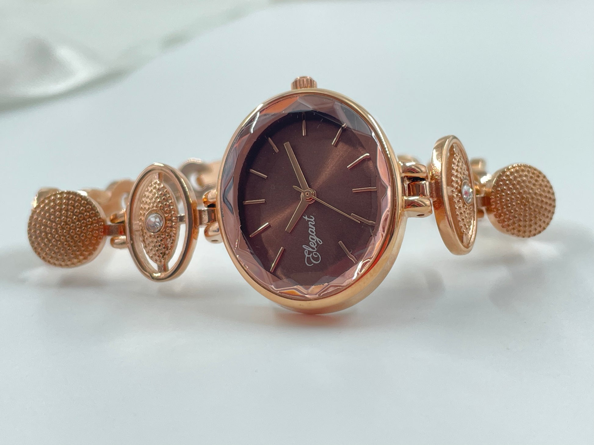 Elevate your elegance with the BTC Elegant Ladies Watch, designed to make every moment special. This exquisite timepiece features a luxurious rose gold-tone bracelet paired with a stylish oval dial available in rich brown and classic green hues, perfect for any occasion. The intricate bracelet design showcases textured round links and sparkling oval accents set with crystal stones, blending sophistication and modern artistry.