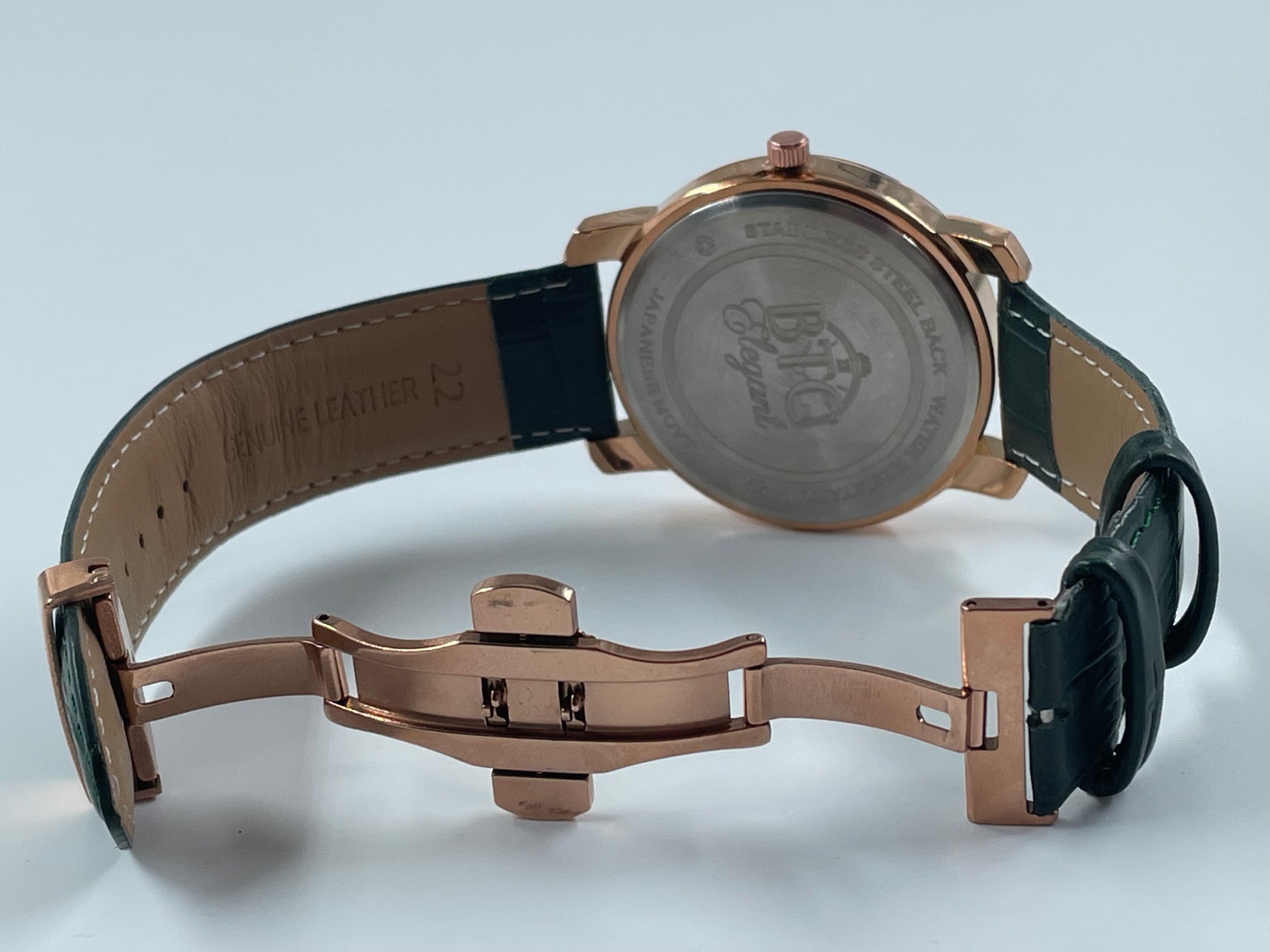 The dark green genuine leather strap with crocodile texture and green stitching blends seamlessly with the dial, while the rose‑gold butterfly deployment clasp ensures a secure, comfortable fit. Perfect with formals, festive outfits, and smart casuals, this BTC Elegant green roman edition is ideal for meetings, celebrations, and also makes a memorable, gift‑worthy timepiece for someone who loves standout colours with a classy finish.
