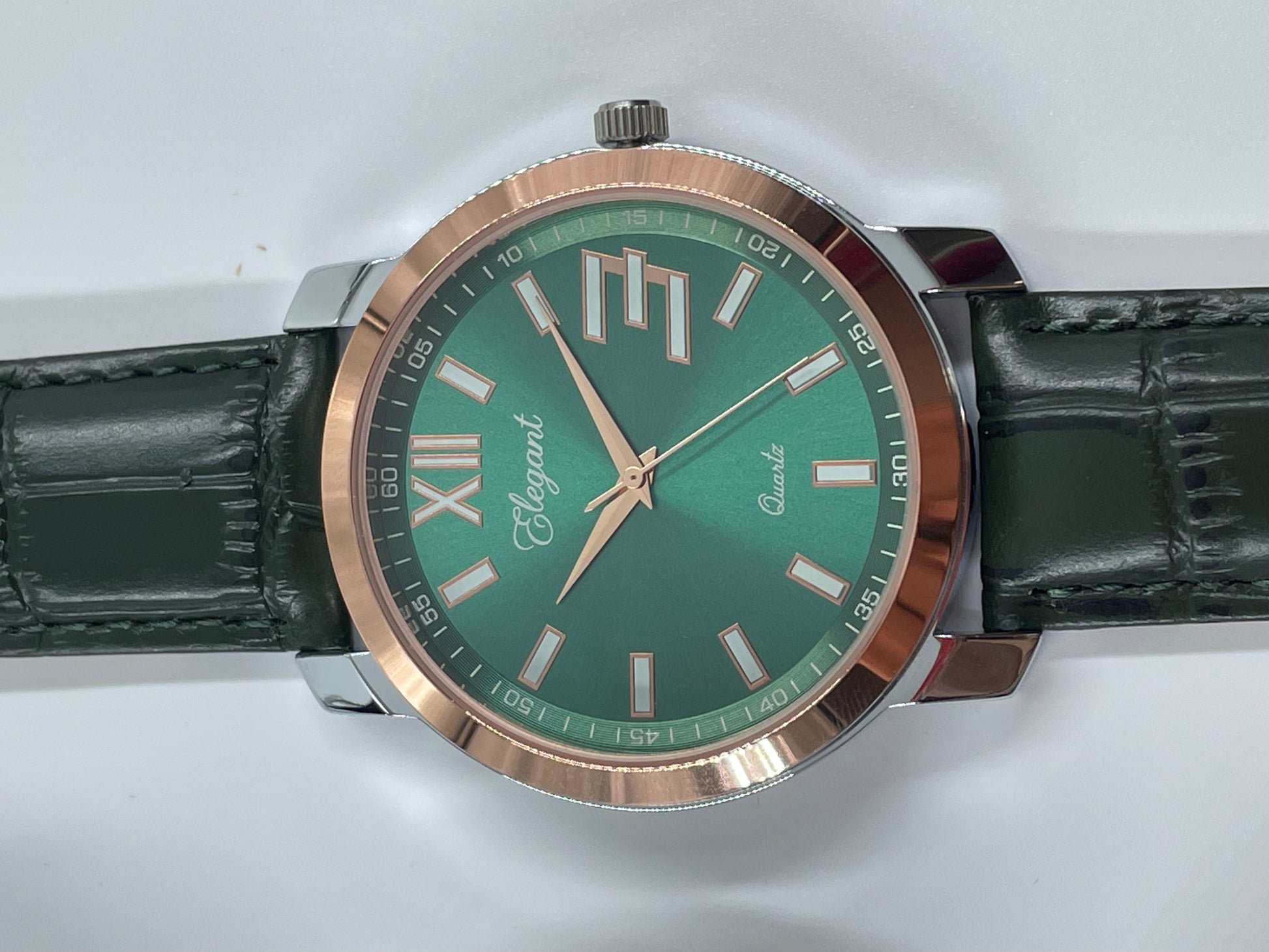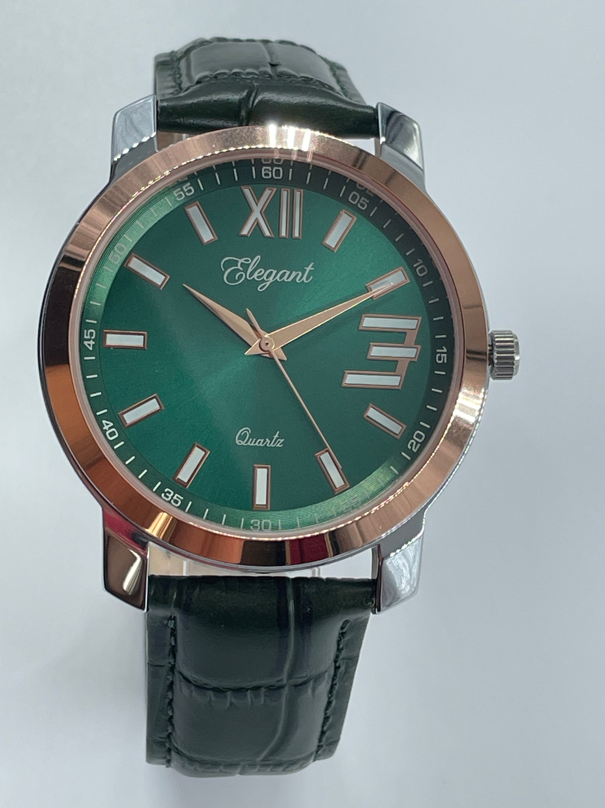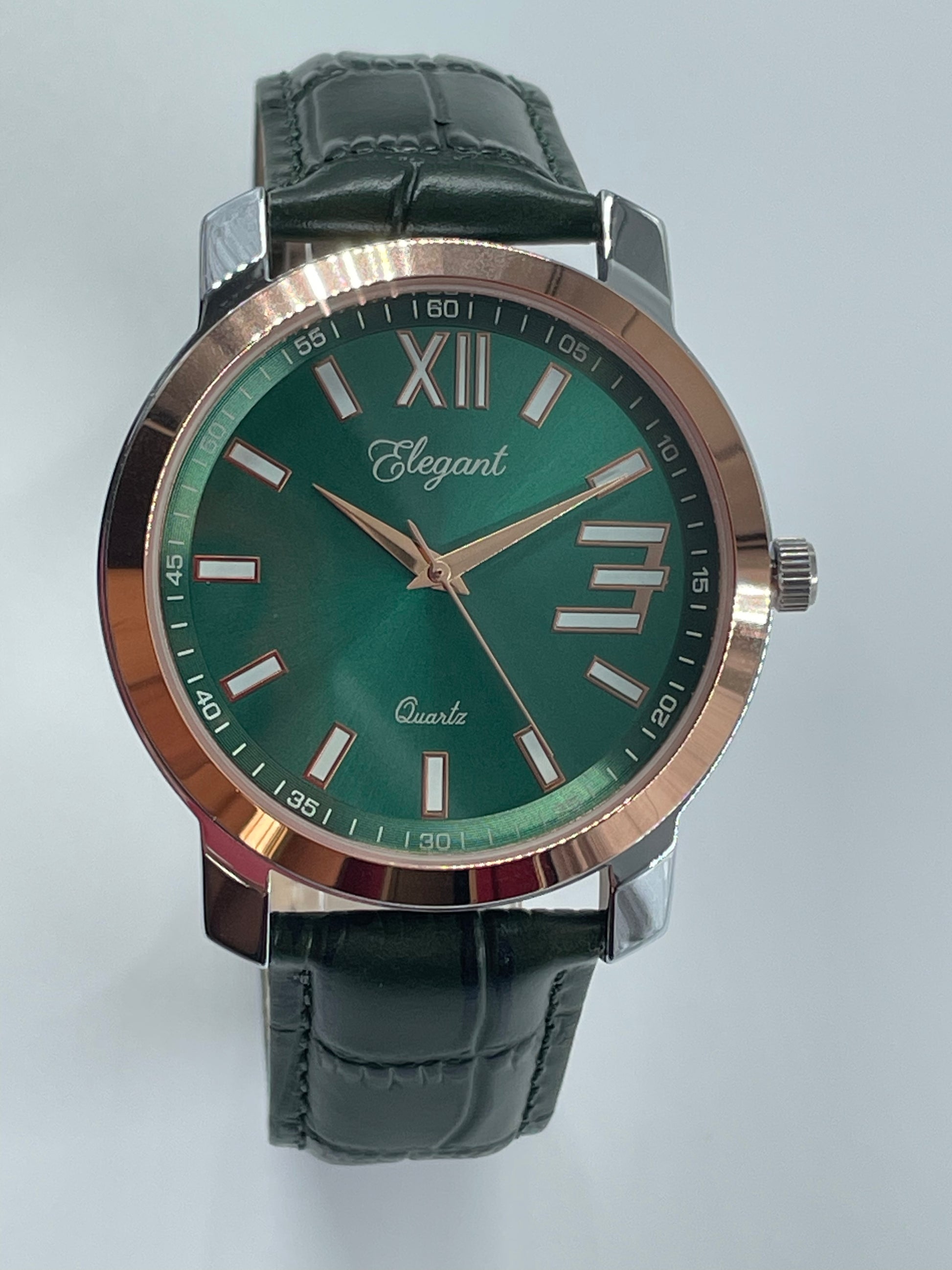 Turn every outfit into a statement with this BTC Elegant Green Roman Dial Watch. The rich emerald sunray dial paired with a rose‑gold bezel and silver‑tone case creates a striking two‑tone look that feels both premium and unique.