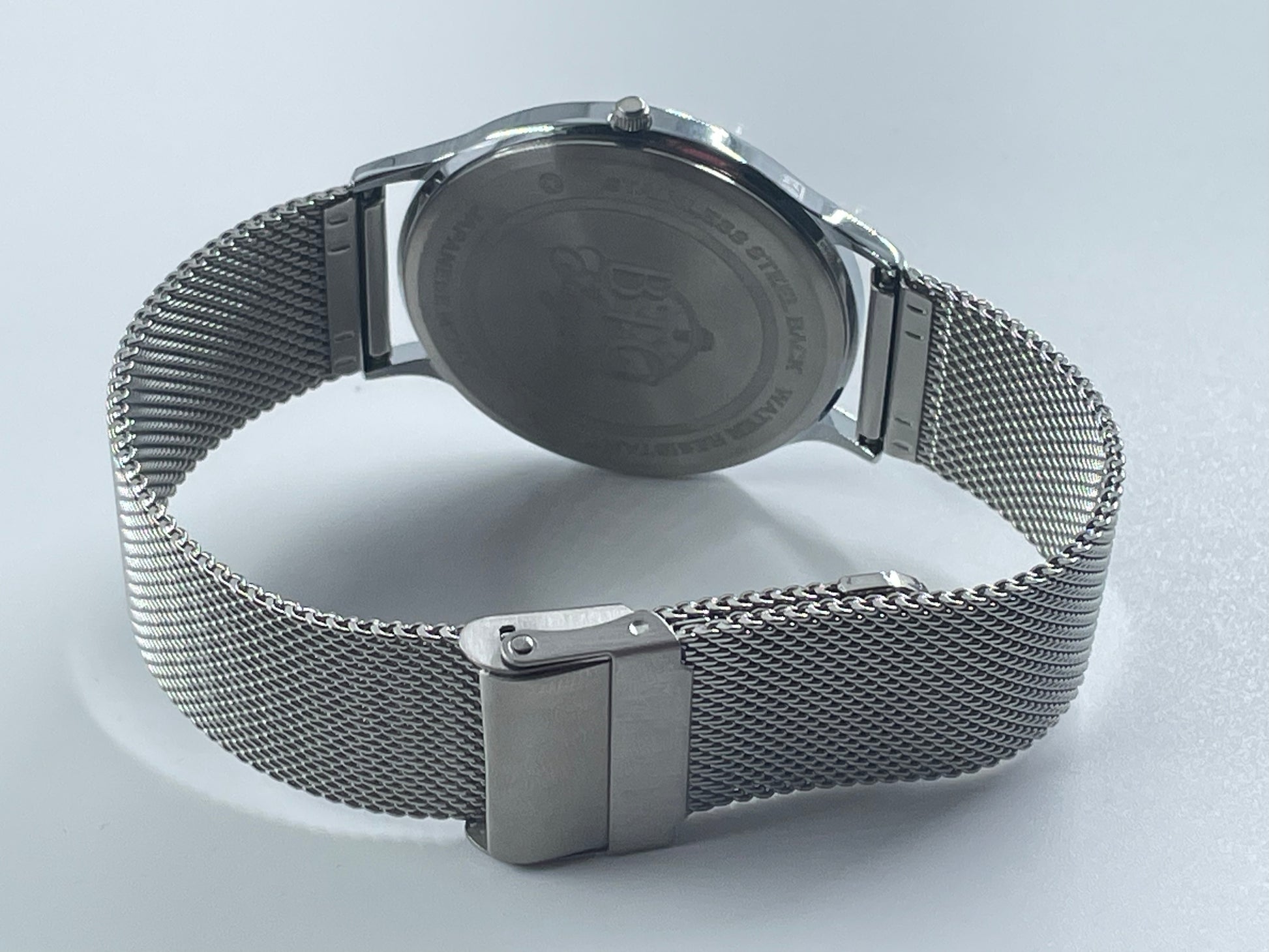 The stainless‑steel mesh strap adds a modern, premium feel and wraps smoothly around the wrist for a light, breathable fit. An adjustable sliding clasp lets you fine‑tune the size in seconds, so the watch sits secure and comfortable without needing links removed.