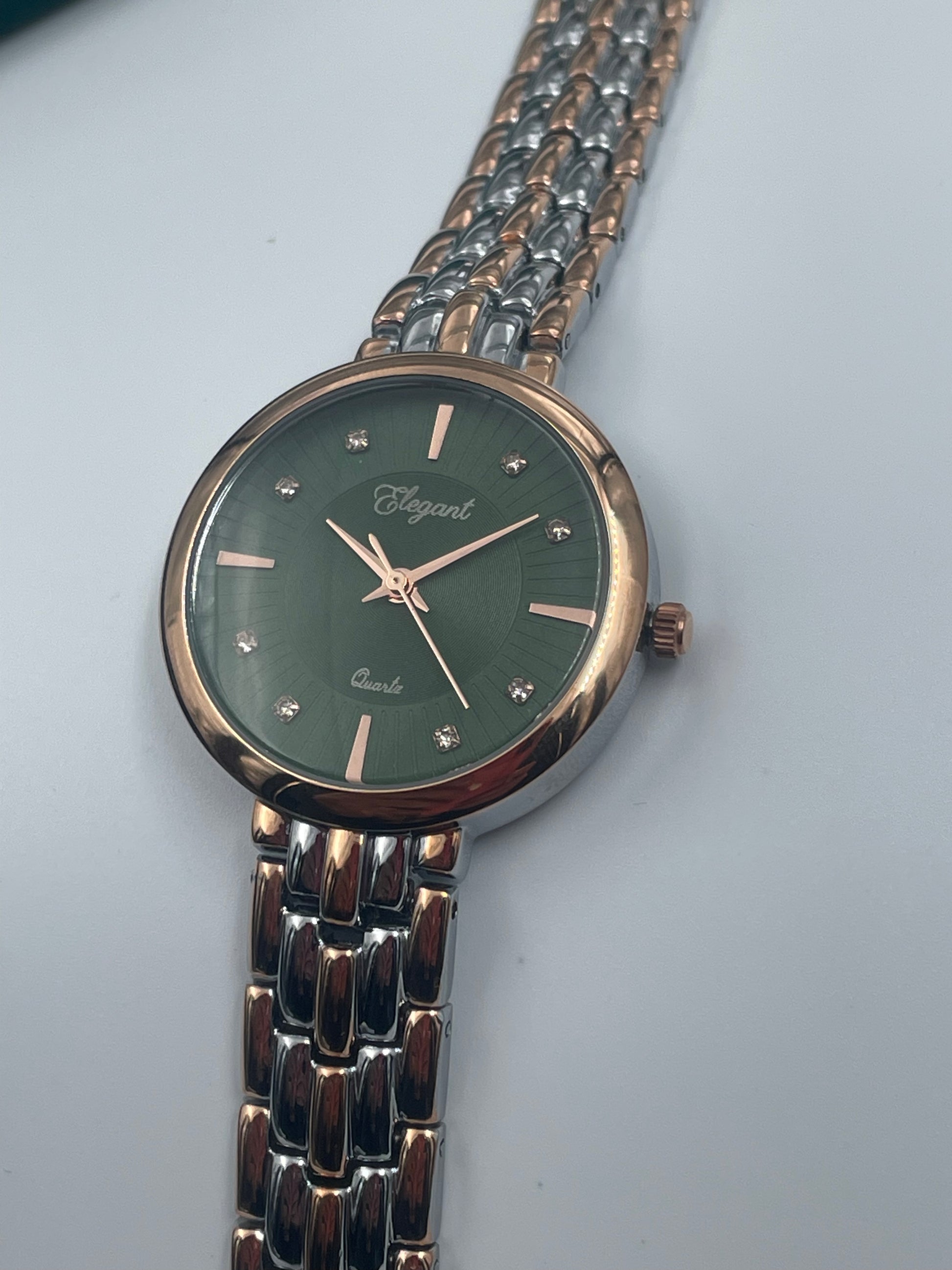 Presenting the BTC Elegant Ladies Watch with a beautiful all-brass case in a stylish two-tone finish. This sophisticated timepiece features a rich green dial adorned with sparkling crystal indices and rose gold accents, exuding class and easy readability. The robust brass case, combined with a dual-tone bracelet in rose gold and silver, ensures a luxurious look while delivering reliable durability.