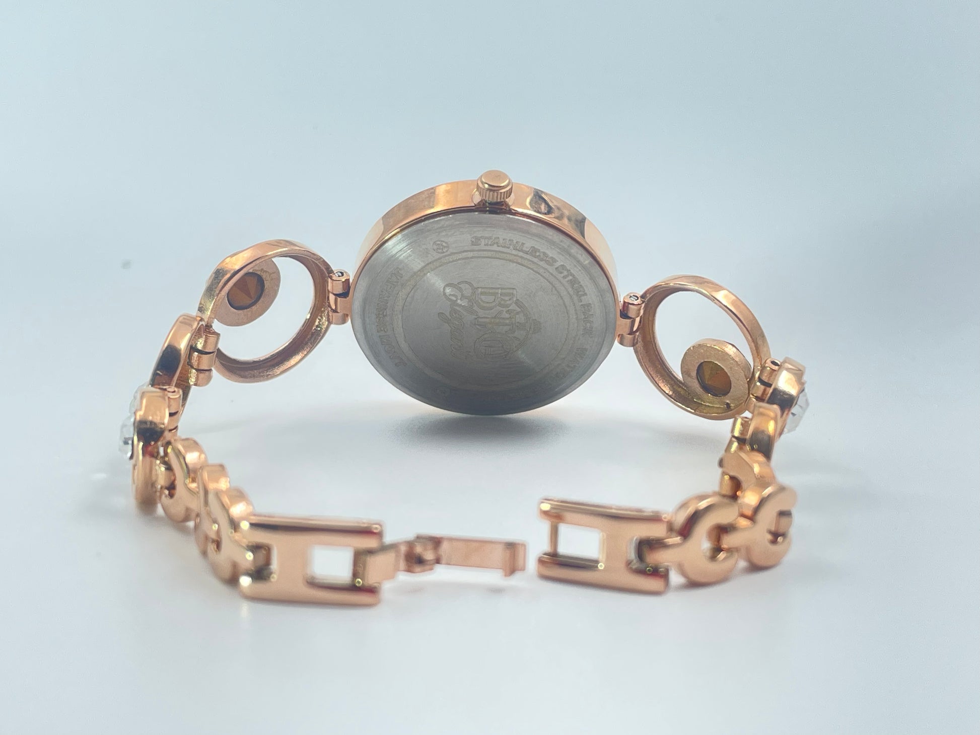 Turn heads with this dazzling wristwatch, featuring a sleek black dial and a delicate rose gold stainless steel strap. The unique bracelet design is adorned with sparkling crystal-studded open circles, giving an elegant, jewelry-like appearance that’s perfect for festive occasions, parties, or everyday luxury.