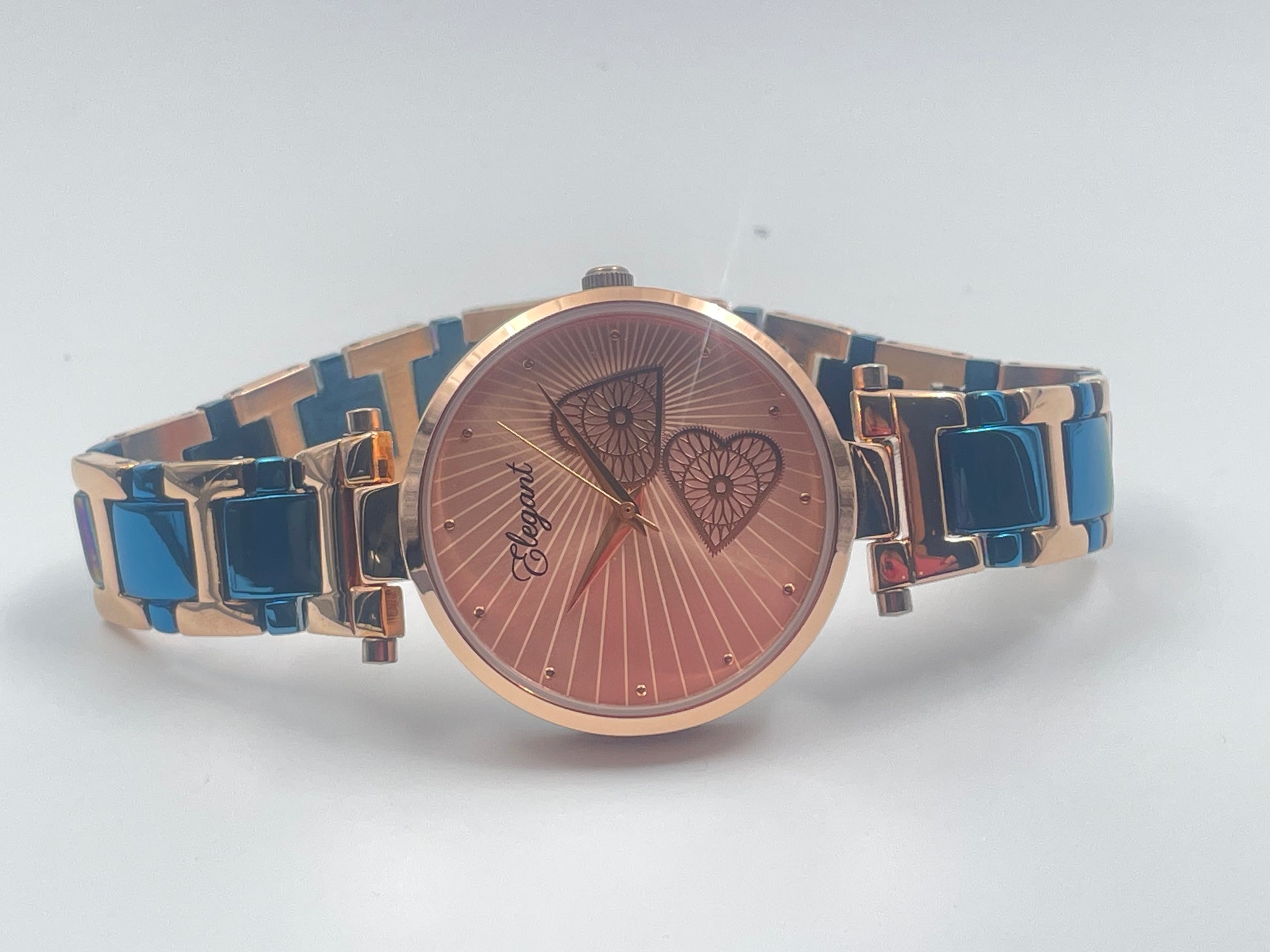 Elevate your style with the BTC Elegant Rose Gold Dial Ladies Watch featuring a premium all-brass case. This contemporary timepiece blends luxury and innovation, showcasing a striking ROSE GOLD dial with an intricate dual-heart design and minimalist dot hour markers for a sophisticated statement. The rose gold-tone brass case and matching bracelet, accented with vibrant blue links, offer a unique and fashionable look that stands out in any collection.