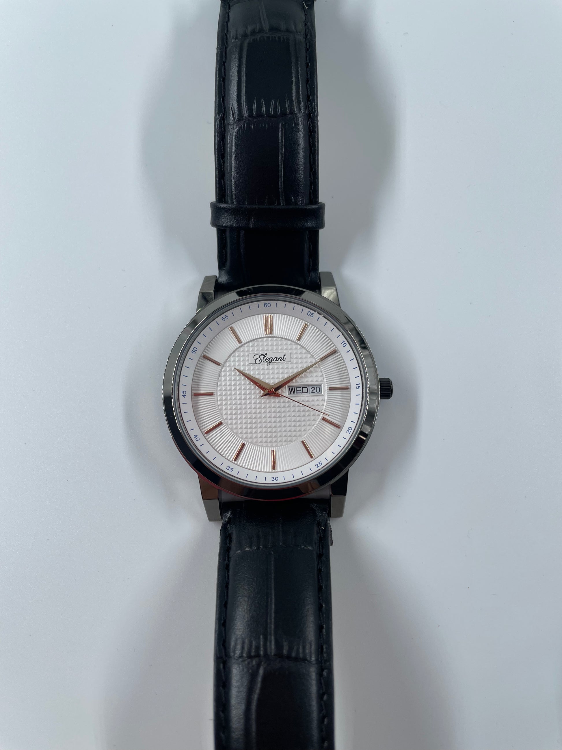 The black genuine leather strap with crocodile texture and neat stitching offers all‑day comfort and a refined finish, secured by a sturdy stainless‑steel buckle. Style this watch with formals, business casuals, or even smart weekend outfits. The BTC Elegant white day‑date edition is also a great gifting choice for anyone who loves modern design with a timeless, sophisticated feel.