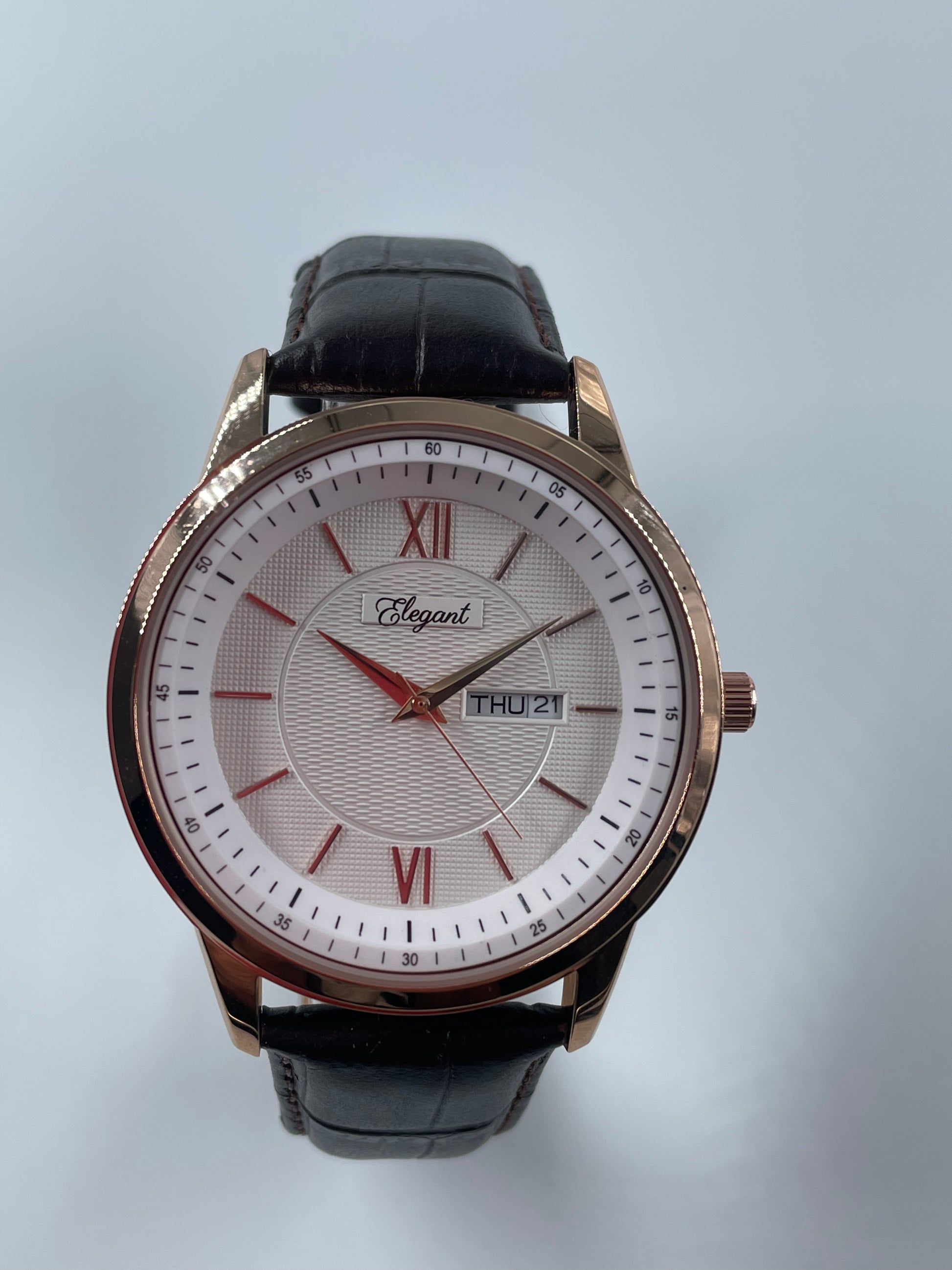 The dark brown genuine leather strap with crocodile pattern and contrast stitching adds a classy finish, paired with a rose‑gold butterfly deployment clasp for extra comfort and a secure, high‑end feel. Style this BTC Elegant white roman day‑date edition with formals, business casuals, or ethnic wear, or gift it to someone who appreciates modern design with timeless sophistication.