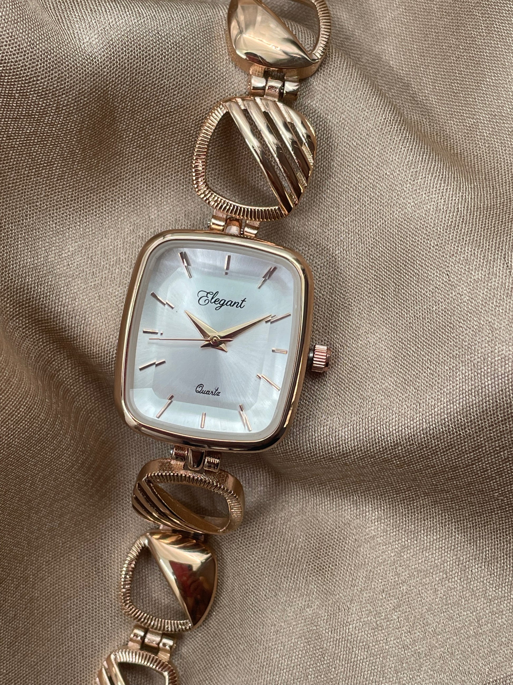 - Unique square SILVER dial with gold-tone accents and “Elegant” branding
